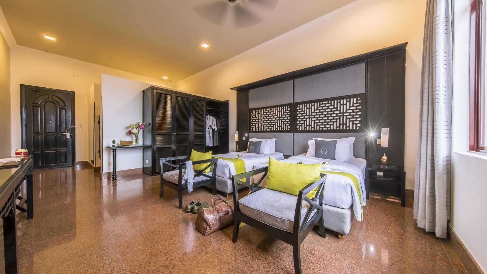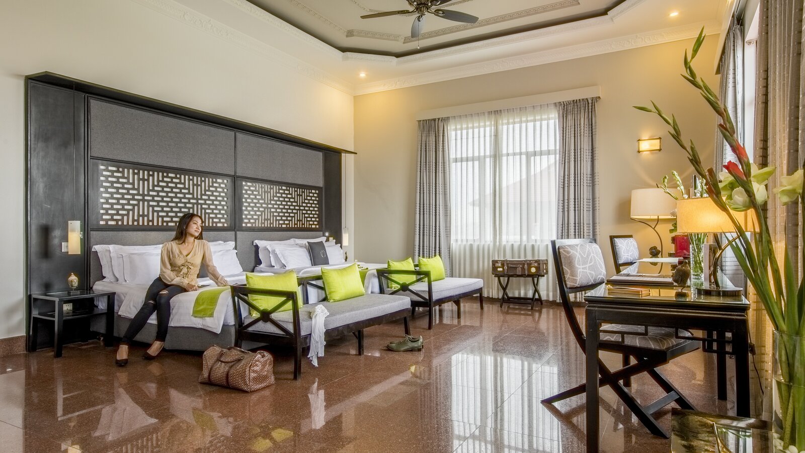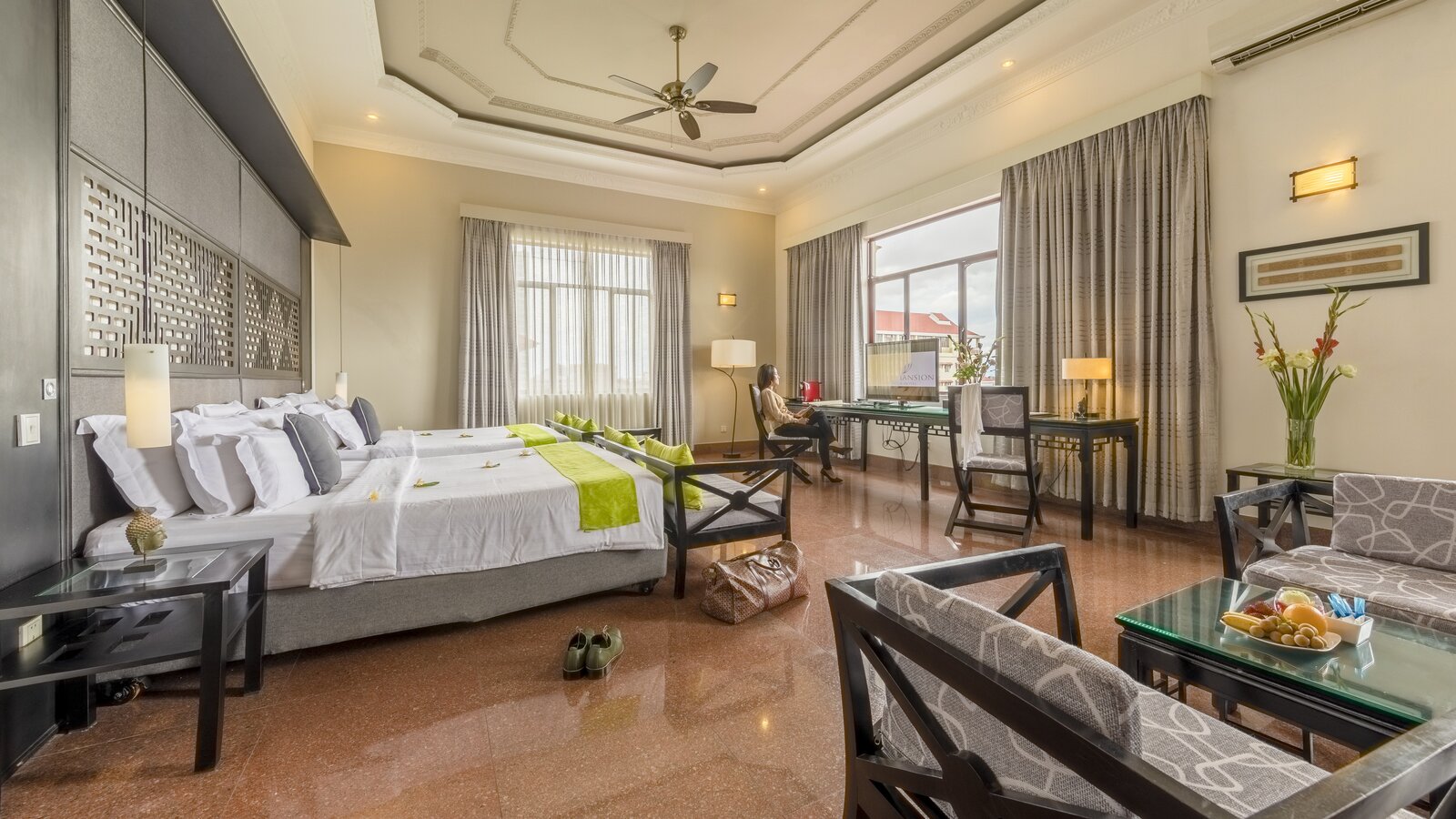 Get the mansion vibe with this spacious, stylishly furnished and decorated accommodation. Casual chic with timeless Asian touch. Sitting area, working station, en-suite bathroom, balcony with garden or city view.