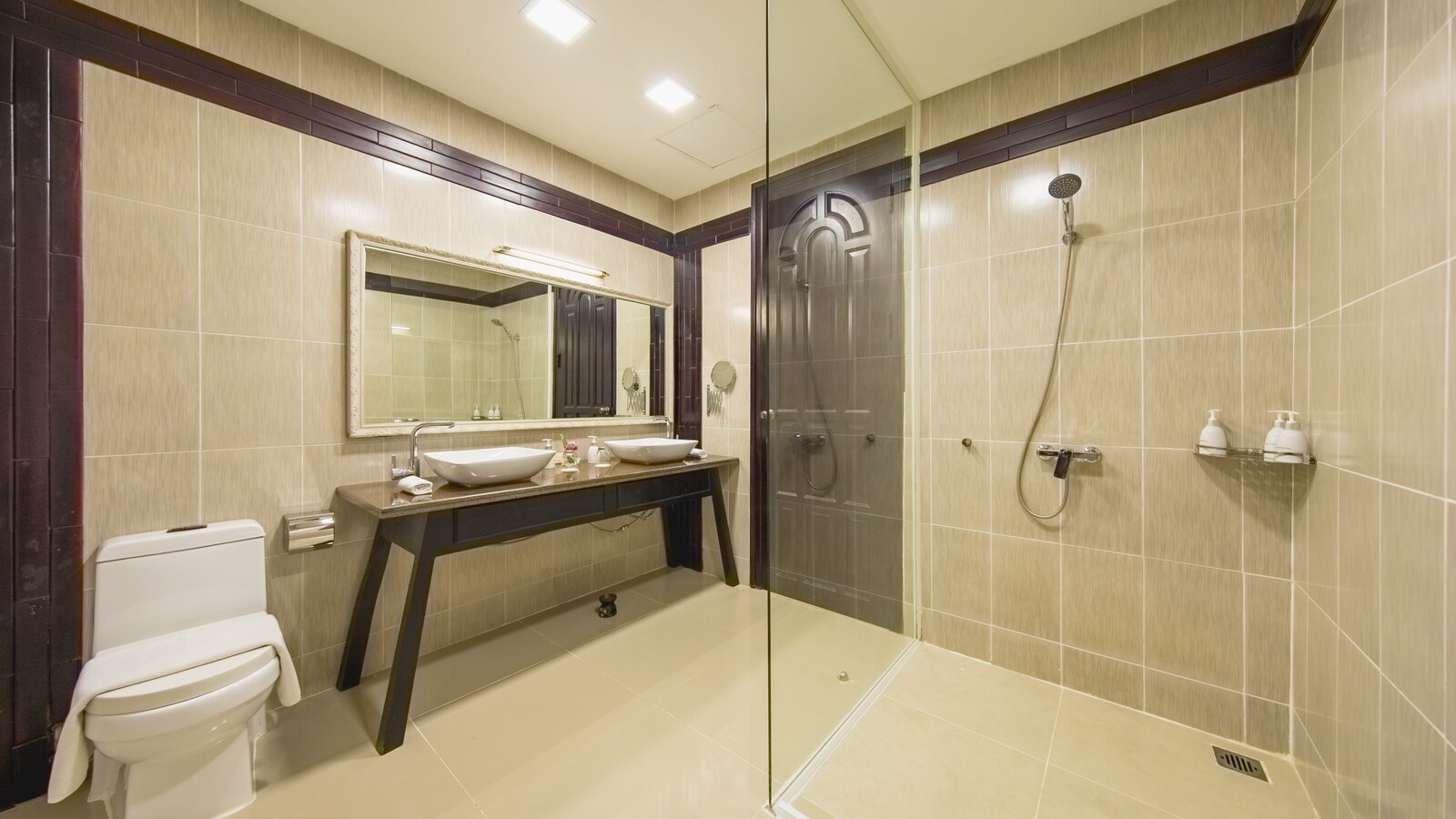 - 1 shower, 2 sinks, toilet
